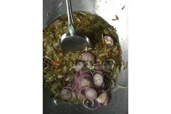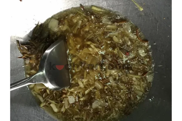 Apabila ikan bilis sudah menguning, kau masukkan taucu. Kacau rata